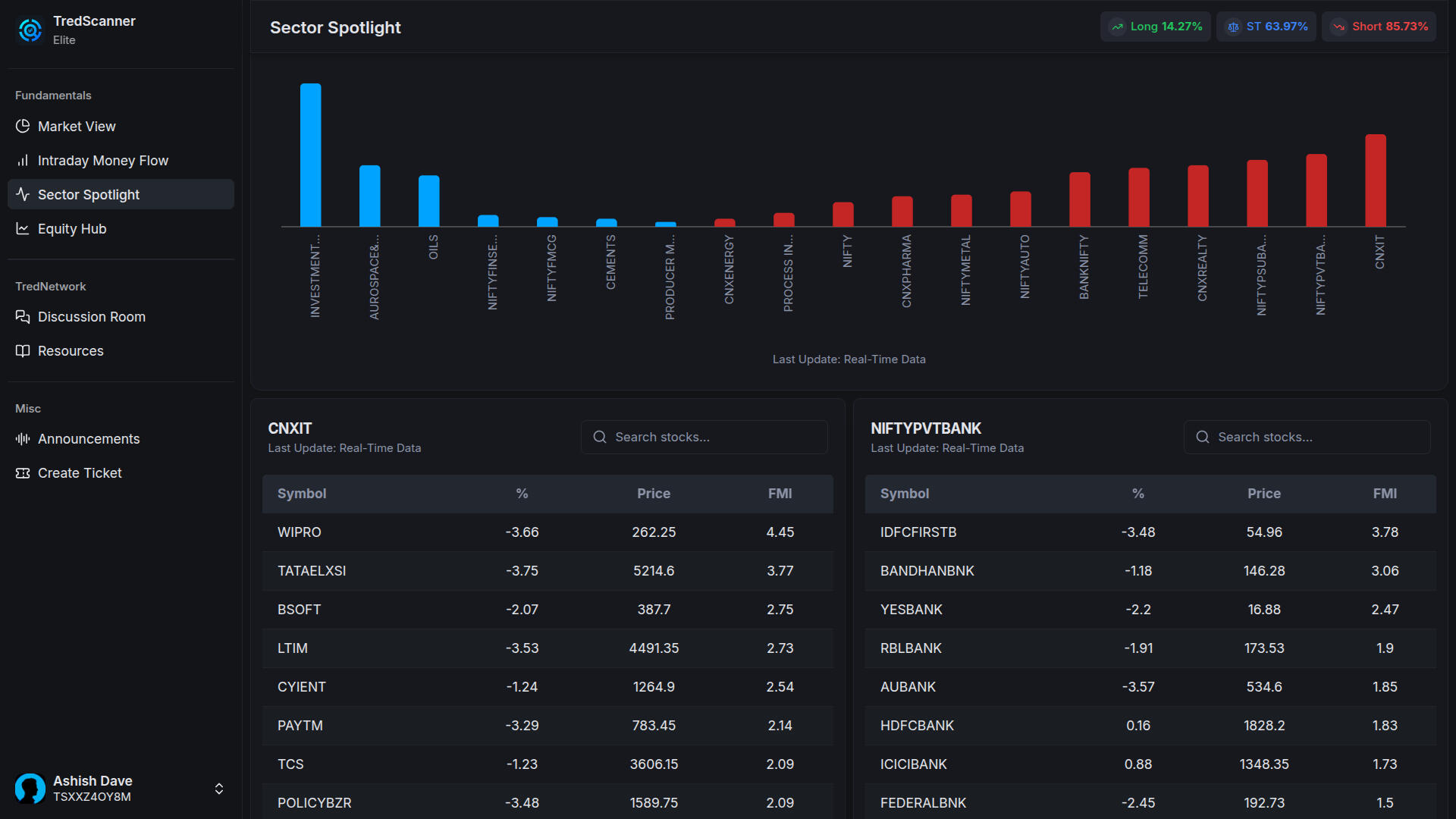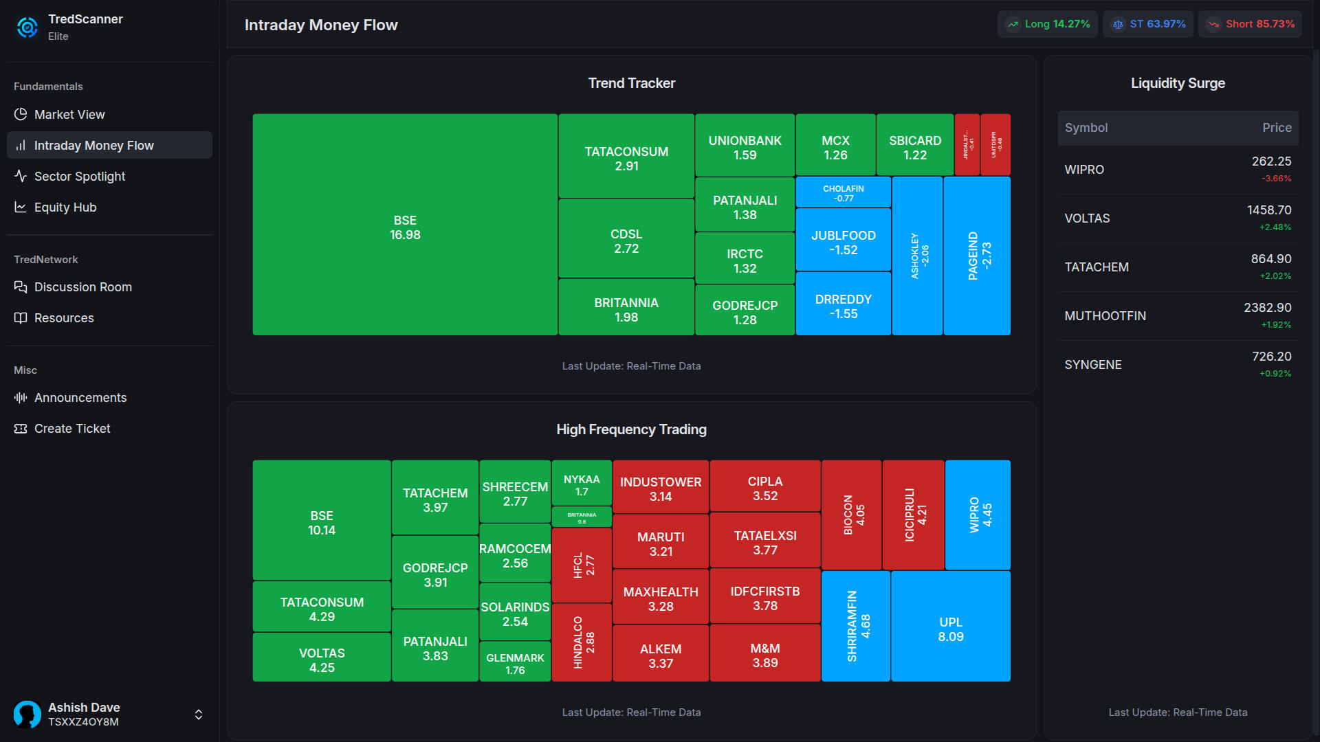 Toolkit with Realtime Trends, High Frequency Trade Insights, Liquidity Tracking, Fund Activity Analysis, Top Performing Sector, Equity Benchmark and all the tools you need for smarter, faster trading